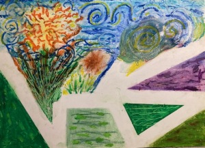 「無題」渦巻と直線と色の組み合わせ。クレヨン、パステル。